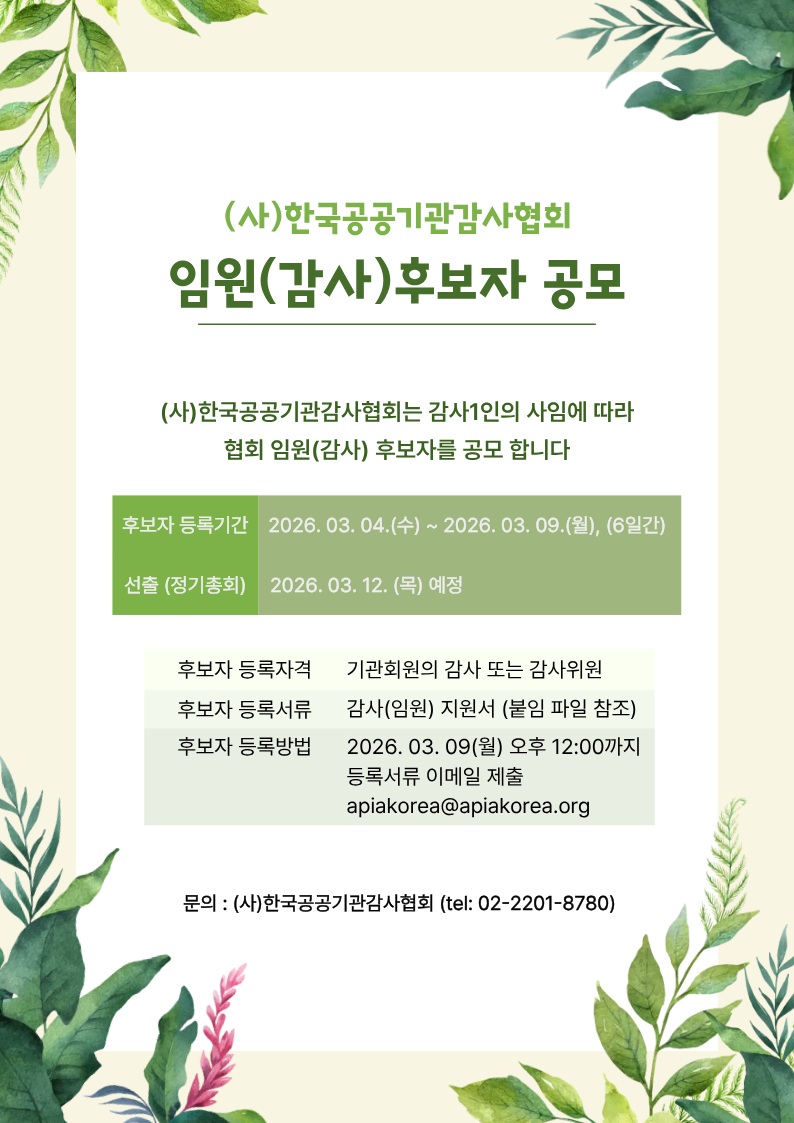 | - | (사)한국공공기관감사협회 임원(감사) 후보자 공모(~2026.03.09.) | 공감사무 | 2026-03-04 |