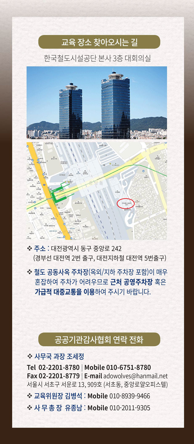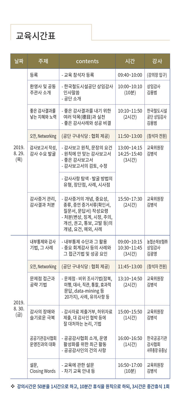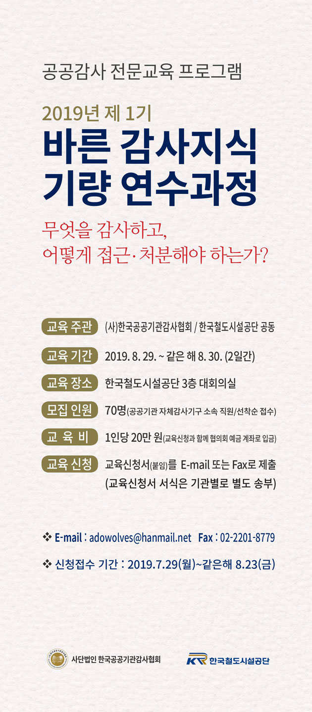 「2019년 제1기 바른 감사지식․기량 연수과정」감사전문 교육과정(한국철도시설공단과 공동 주최)을 개설하였습니다.