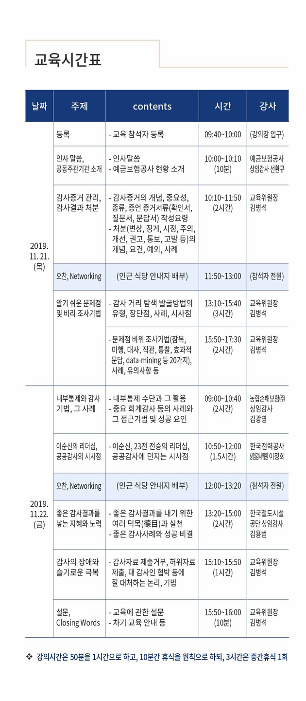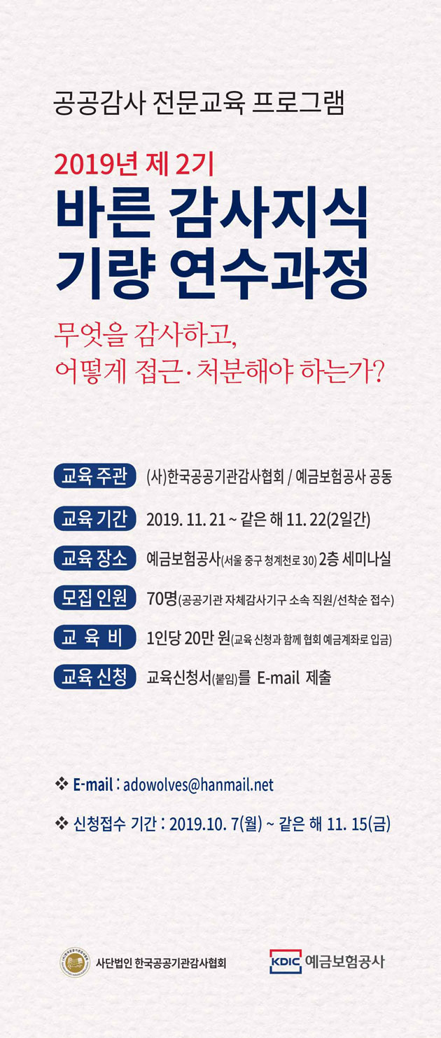 협회는 2019년 7월 내부감사인 교육․훈련을 기획하고 시행할 교육위원회를 새로 발족하여 「2019년 제2기 바른 감사지식․기량 연수과정」 감사전문 교육과정(예금보험공사 공동 주최)을 개설하였습니다. 위와 관련하여 다음과 같이 안내하오니 참가신청서를 제출하여 주시기 바랍니다.