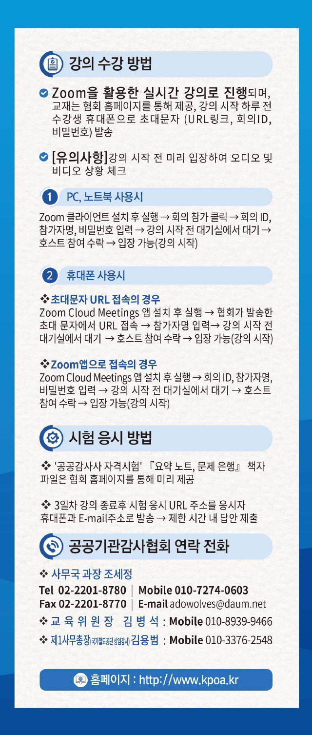 – 교육대상자 교육시간 최대 21시간 인정 및 공공감사사 수료증 제공