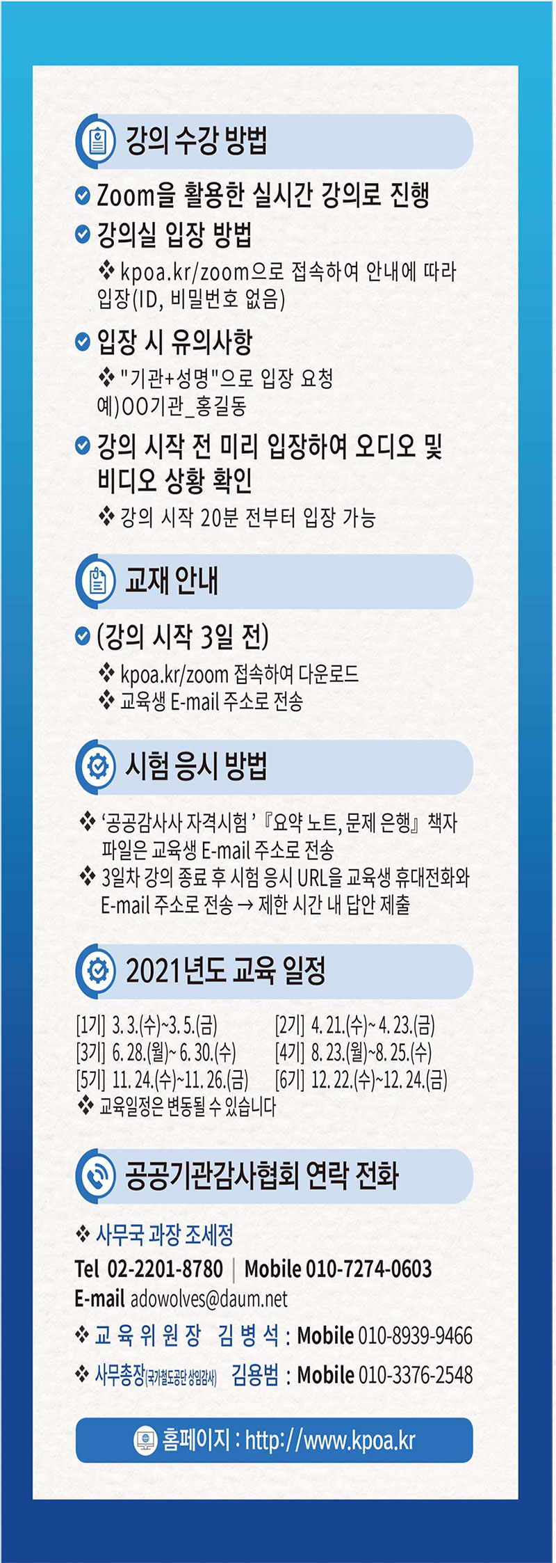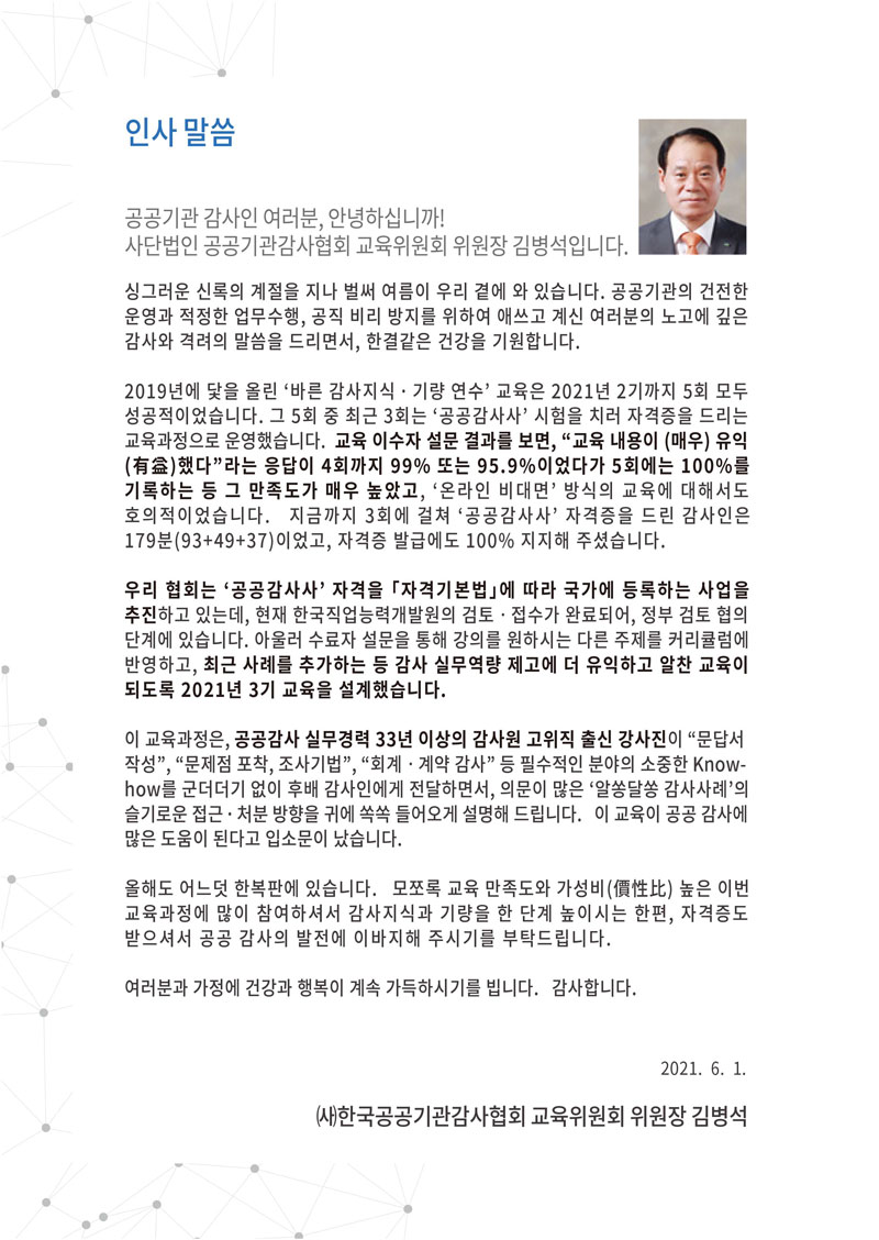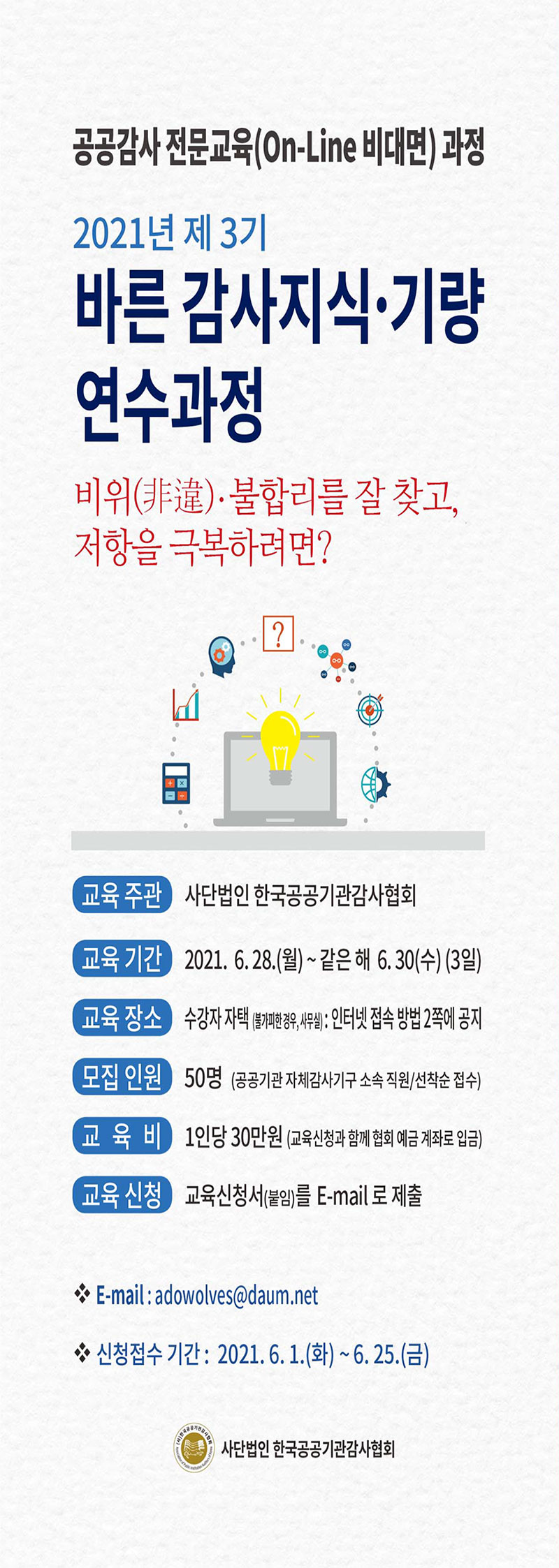 2. 협회는 감사인들의 전문성 향상을 위한『2021년 제3기 바른 감사지식․기량 비대면 온라인 연수과정(ZOOM 실시간 강의)』수강 신청을 받고 있습니다.