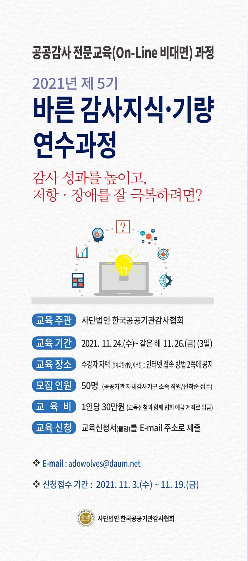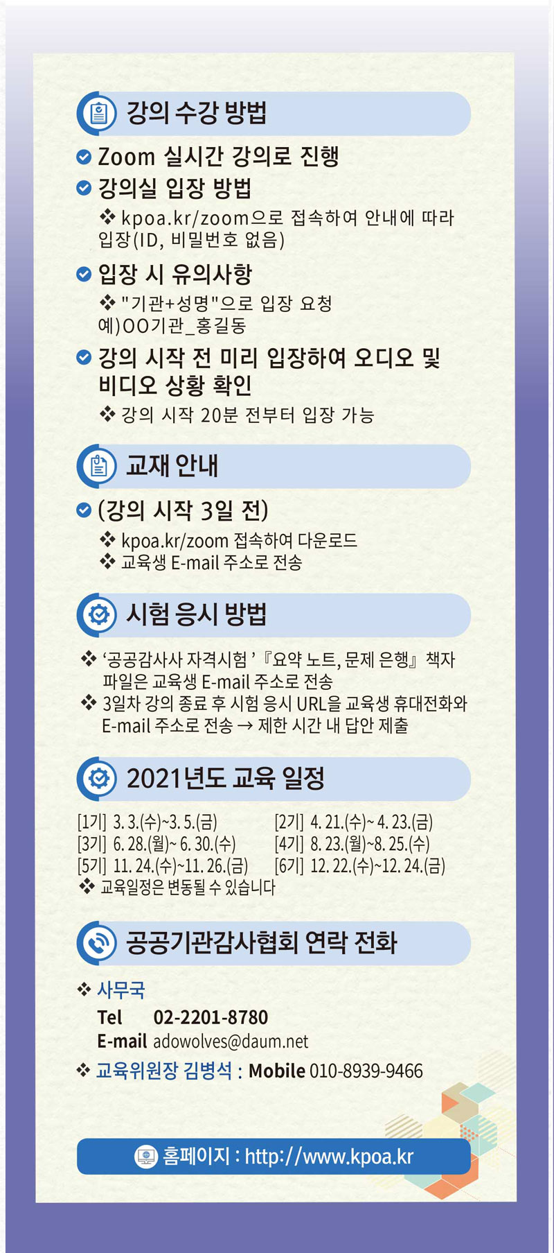 2. 협회는 감사인들의 전문성 향상을 위한『2021년 제5기 바른 감사지식․기량 비대면 온라인 연수과정(ZOOM 실시간 강의)』 실시하오니 수강 신청하시기 바랍니다.