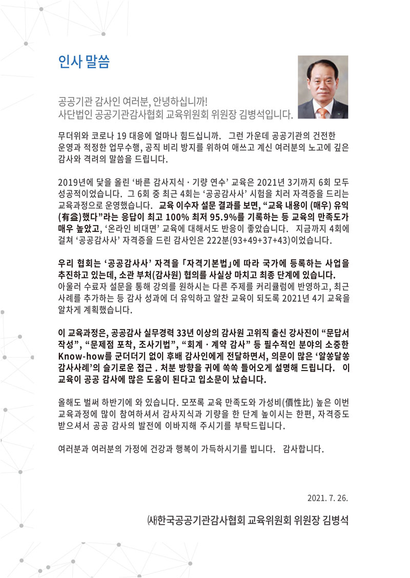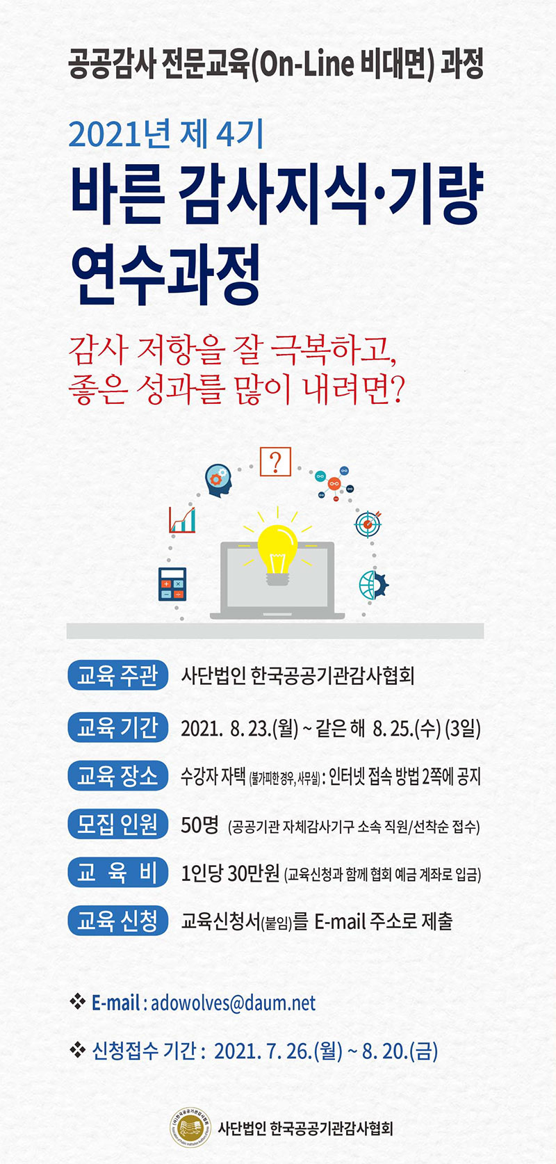 2. 협회는 감사인들의 전문성 향상을 위한『2021년 제4기 바른 감사지식․기량 비대면 온라인 연수과정(ZOOM 실시간 강의)』수강 신청을 받고 있습니다.