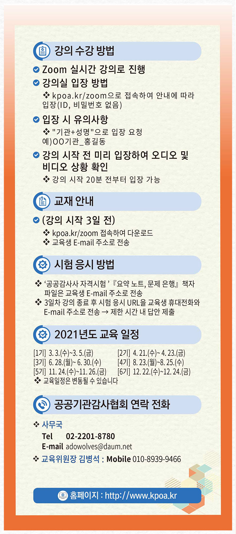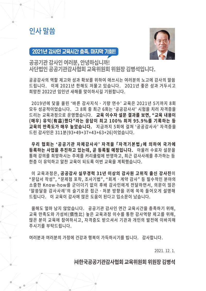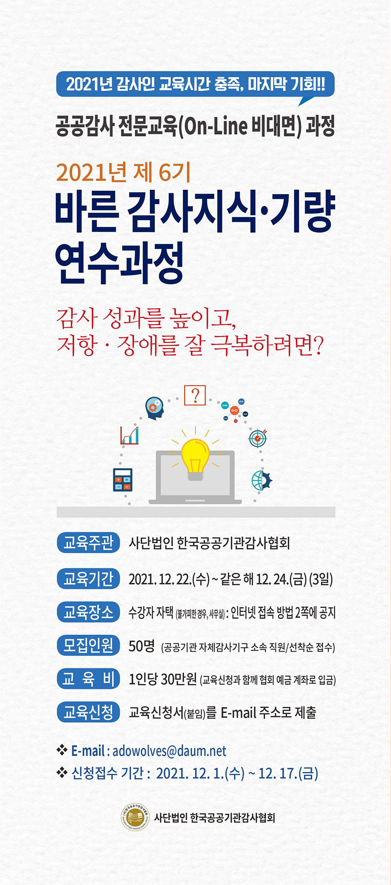 2. 협회는 감사인들의 전문성 향상을 위한『2021년 제6기 바른 감사지식․기량 비대면 온라인 연수과정(ZOOM 실시간 강의)』 실시하오니 수강 신청하시기 바랍니다.