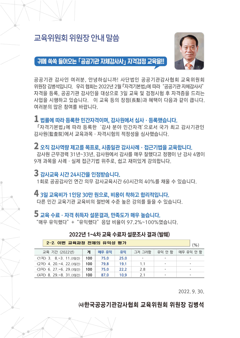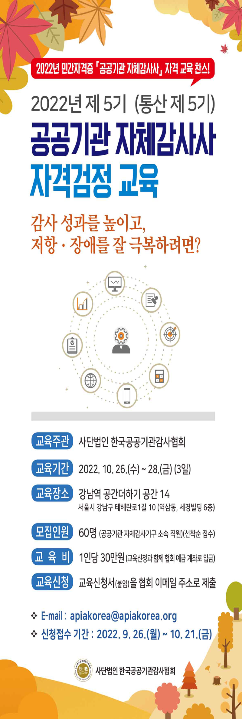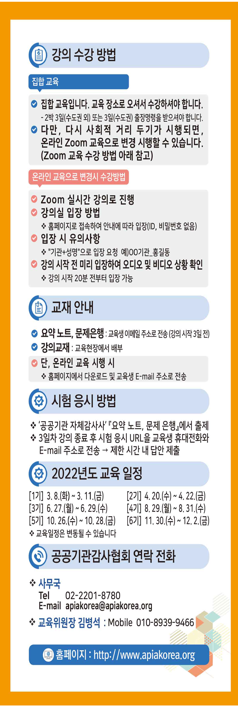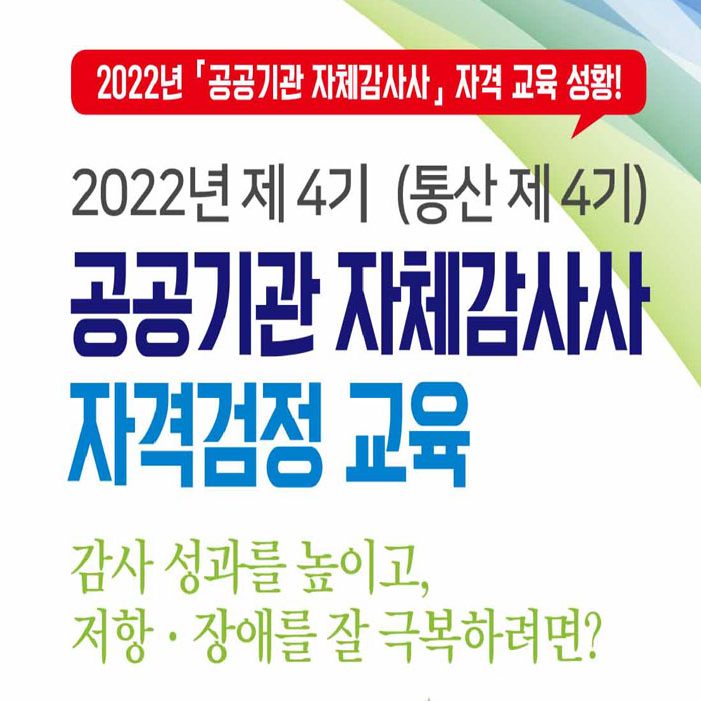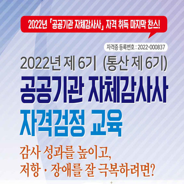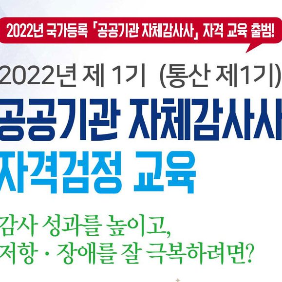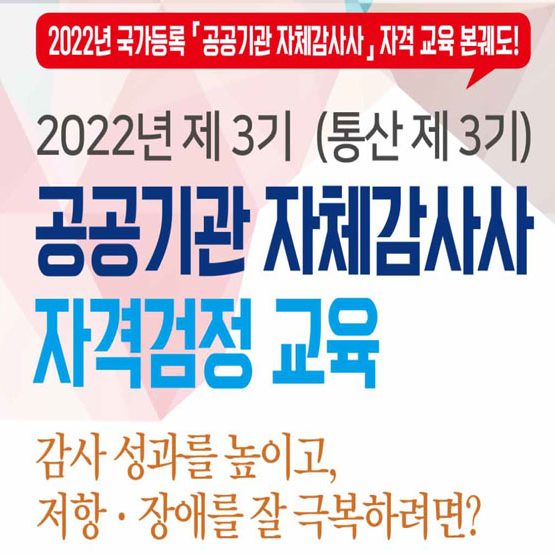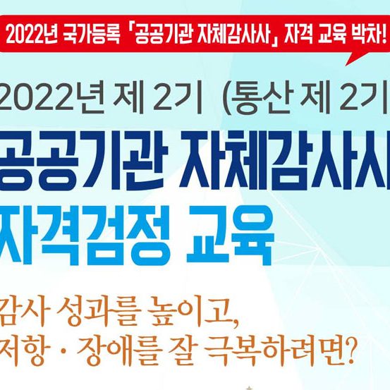 2. 자격기본법 제17조에 따라 「공공기관 자체감사사 자격검정 교육」 다음과 같이 안내드리오니 수강 신청하시기 바랍니다.