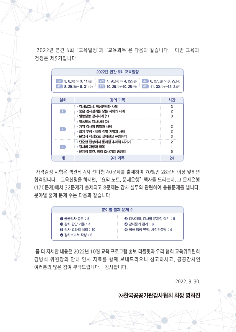 ○교육과정: 2022년 제5기 공공기관 자체감사사 자격검정 교육
