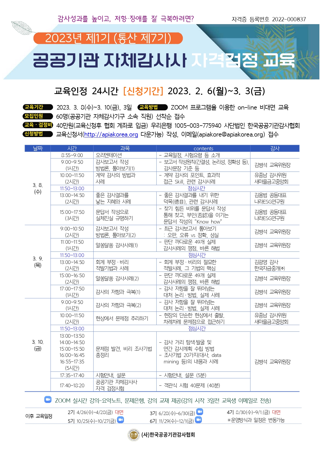 ○교육과정: 2023년 제1기 공공기관 자체감사사 자격 검정 온라인(ZOOM) 실시간 교육