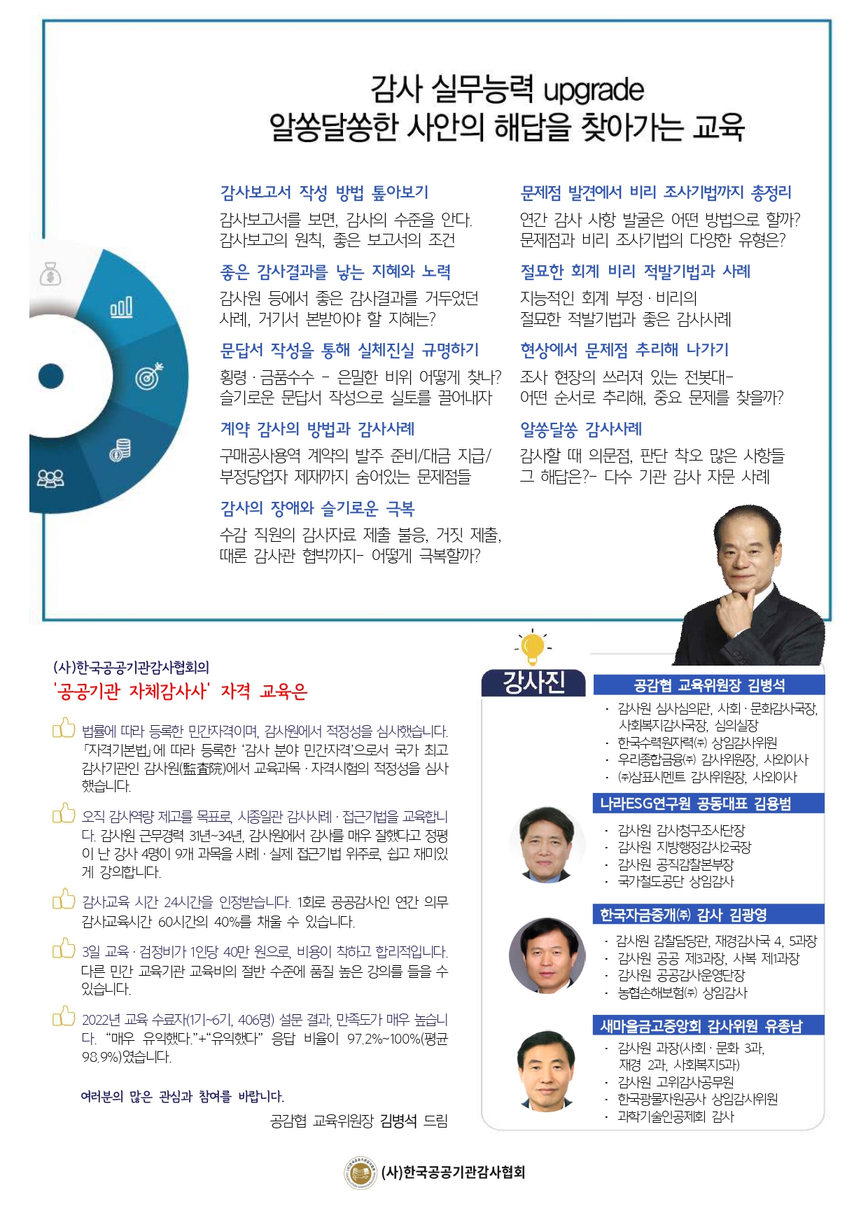 2. 2023년 제1기 「공공기관 자체감사사 자격검정 교육」 교육생을 다음과 같이 모집합니다.