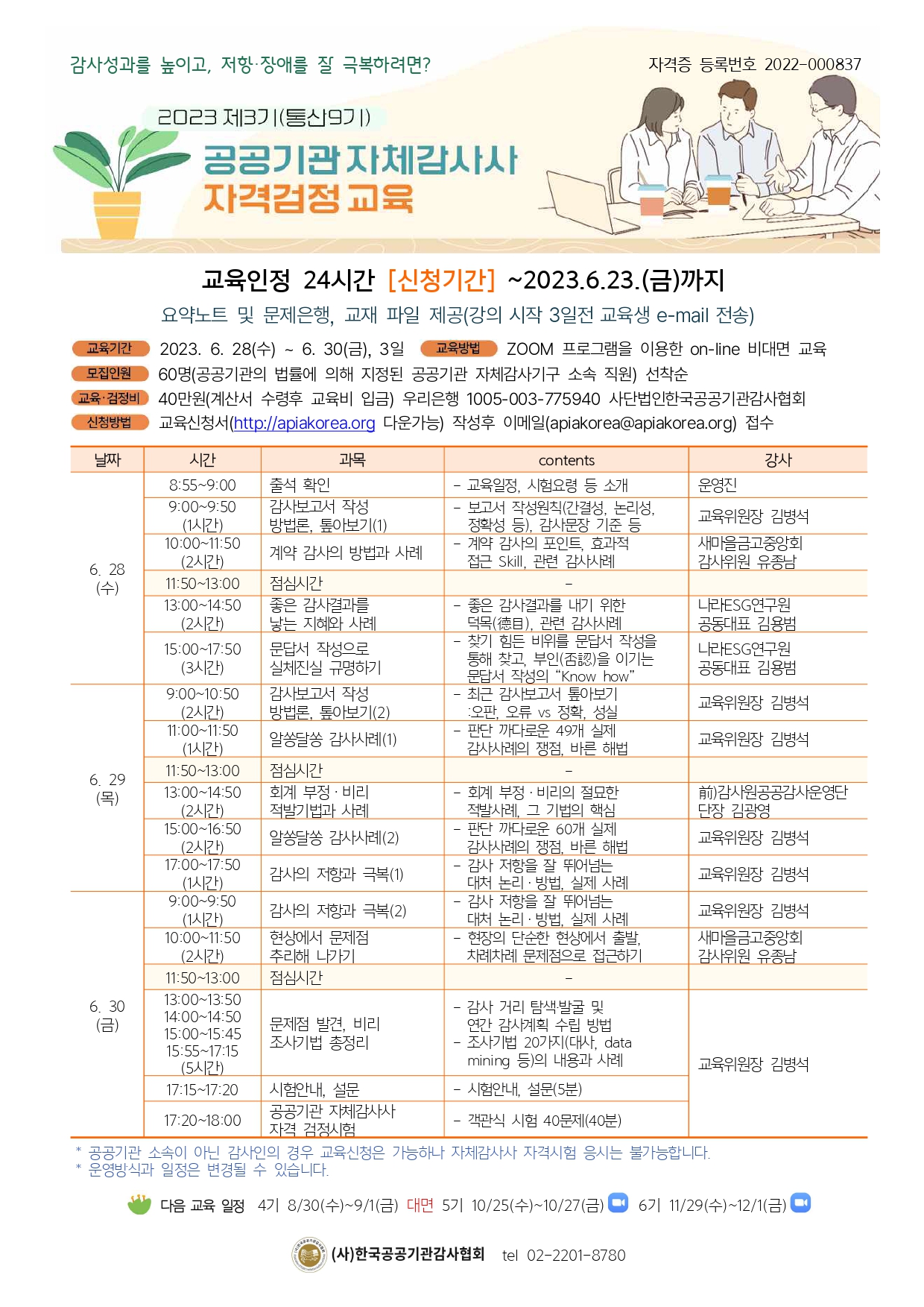 ○교육과정: 2023년 제3기 공공기관 자체감사사 자격 검정 온라인(ZOOM) 실시간 교육