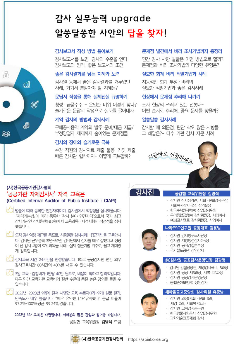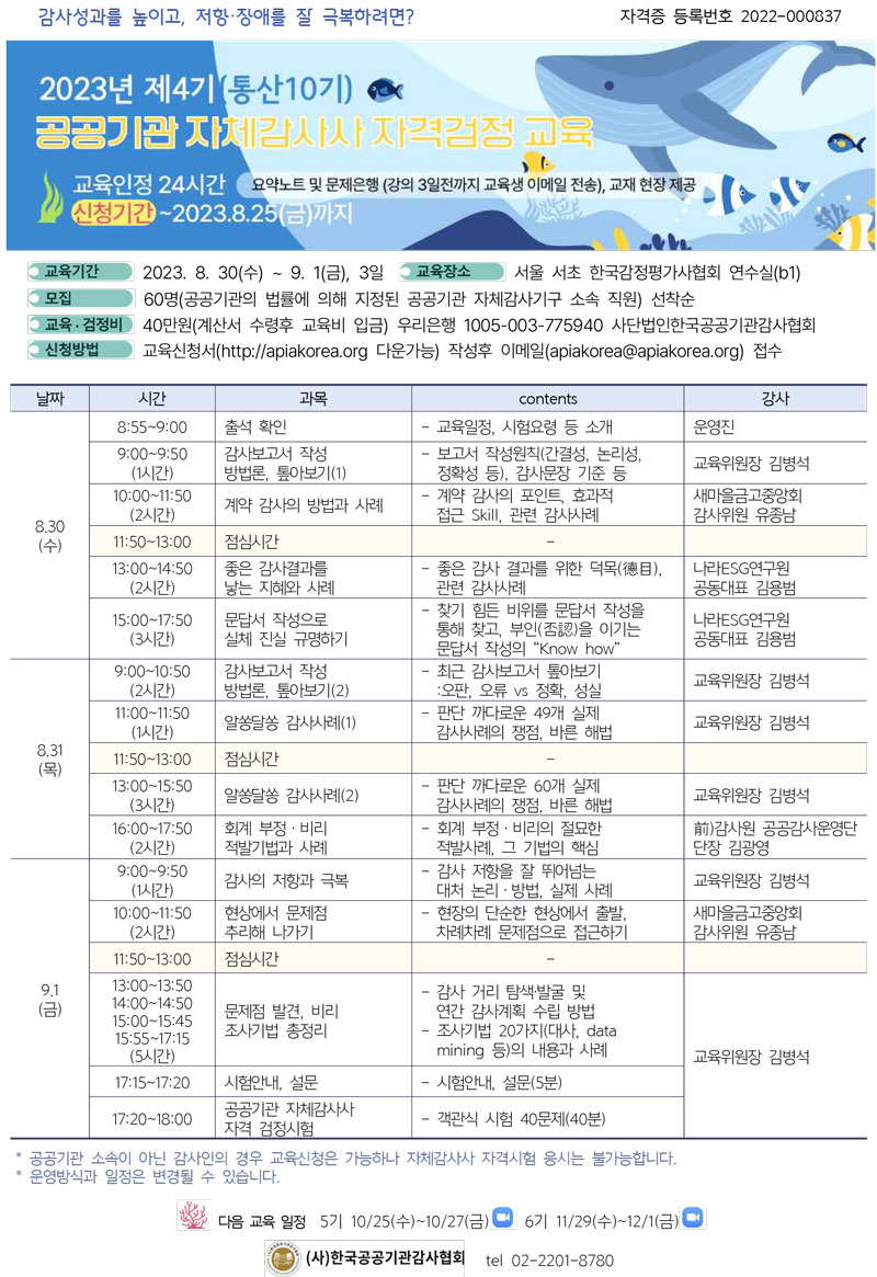 2. 2023년 제4기 「공공기관 자체감사사 자격검정 교육」 교육생을 다음과 같이 모집합니다.