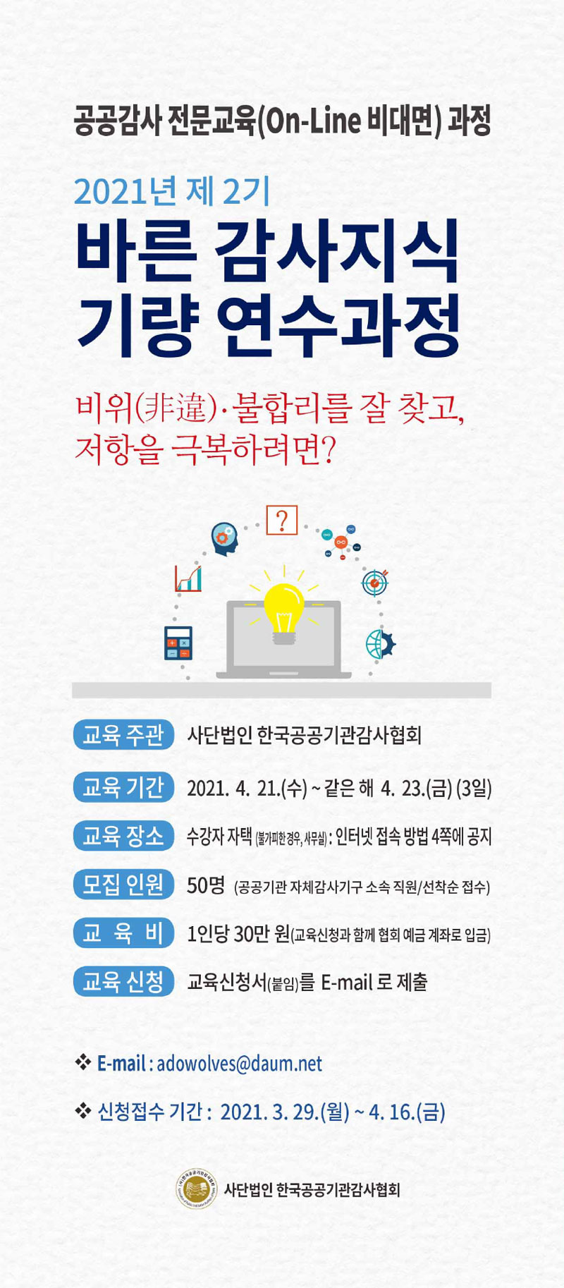 4.21.(수) ~ 23.(금)에 실시되는 「2021년 제2기 바른 감사지식․기량 연수과정」을 다음과 같이 안내하오니 참가신청서를 제출하여 주시기 바랍니다.