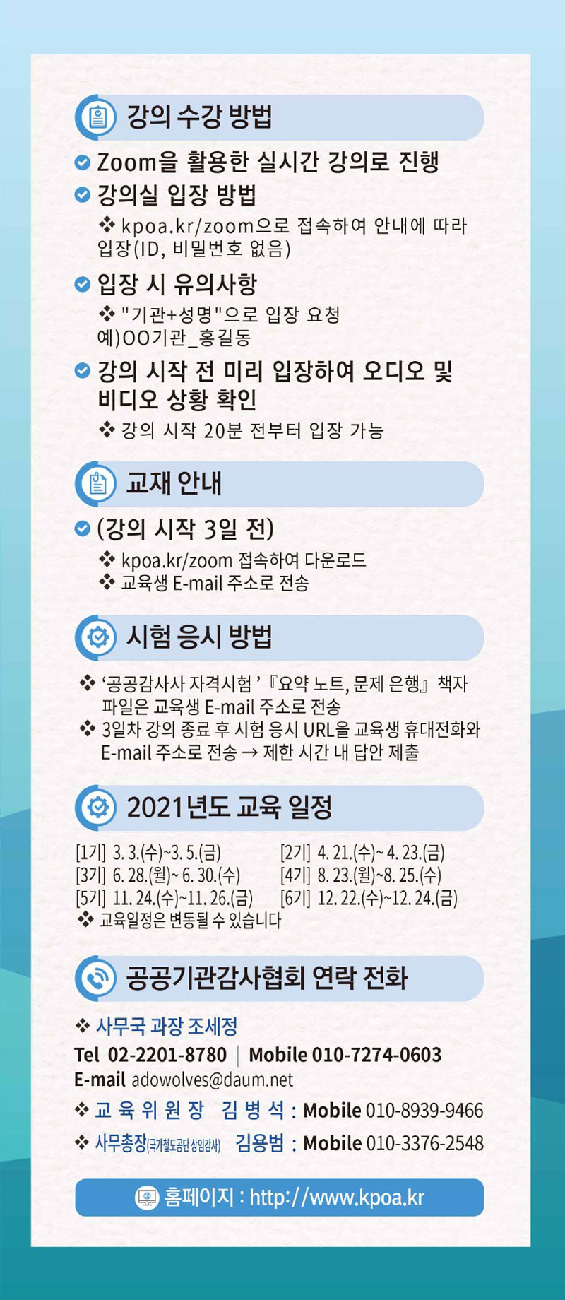 협회는 감사인들의 전문성 향상을 위해 2021년 제2기 바른 감사지식․기량 비대면 온라인 연수과정(ZOOM 이용)을 개설하였습니다.