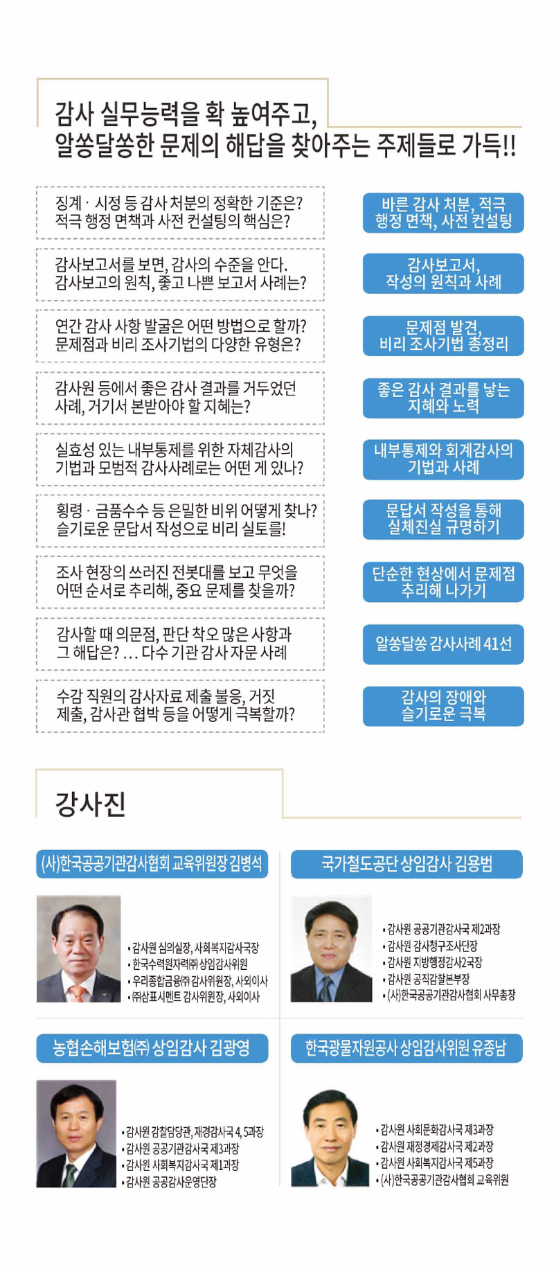 이번 교육에서는 지난 수강생들의 설문 응답을 반영하여 요청 과목 강의 시간 확대와 새로운 감사 사례를 많이 추가하여 공공감사 실무에 보다 더 실질적인 도움이 되도록 구성하였습니다.