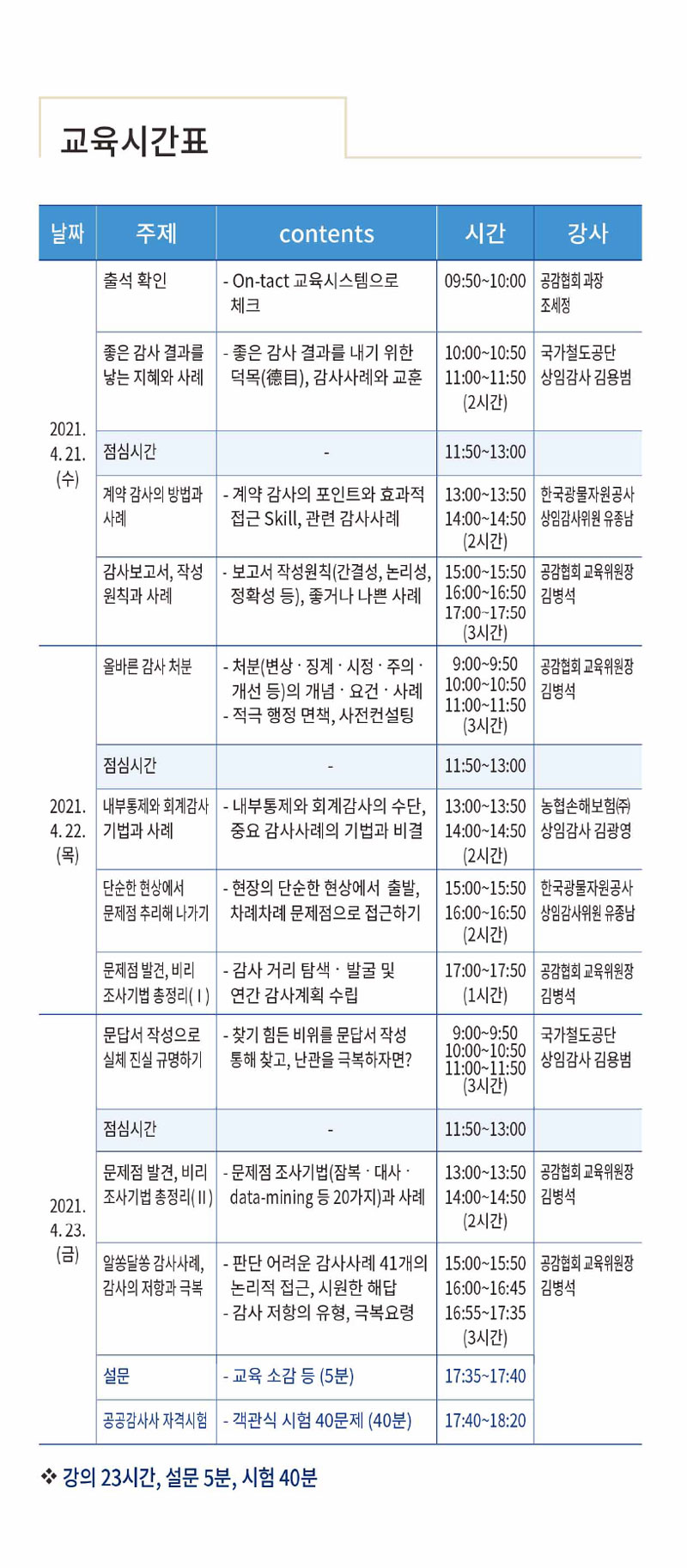 – 교육대상자 교육시간 최대 23시간 인정 수료증 및 공공감사사 자격증 제공